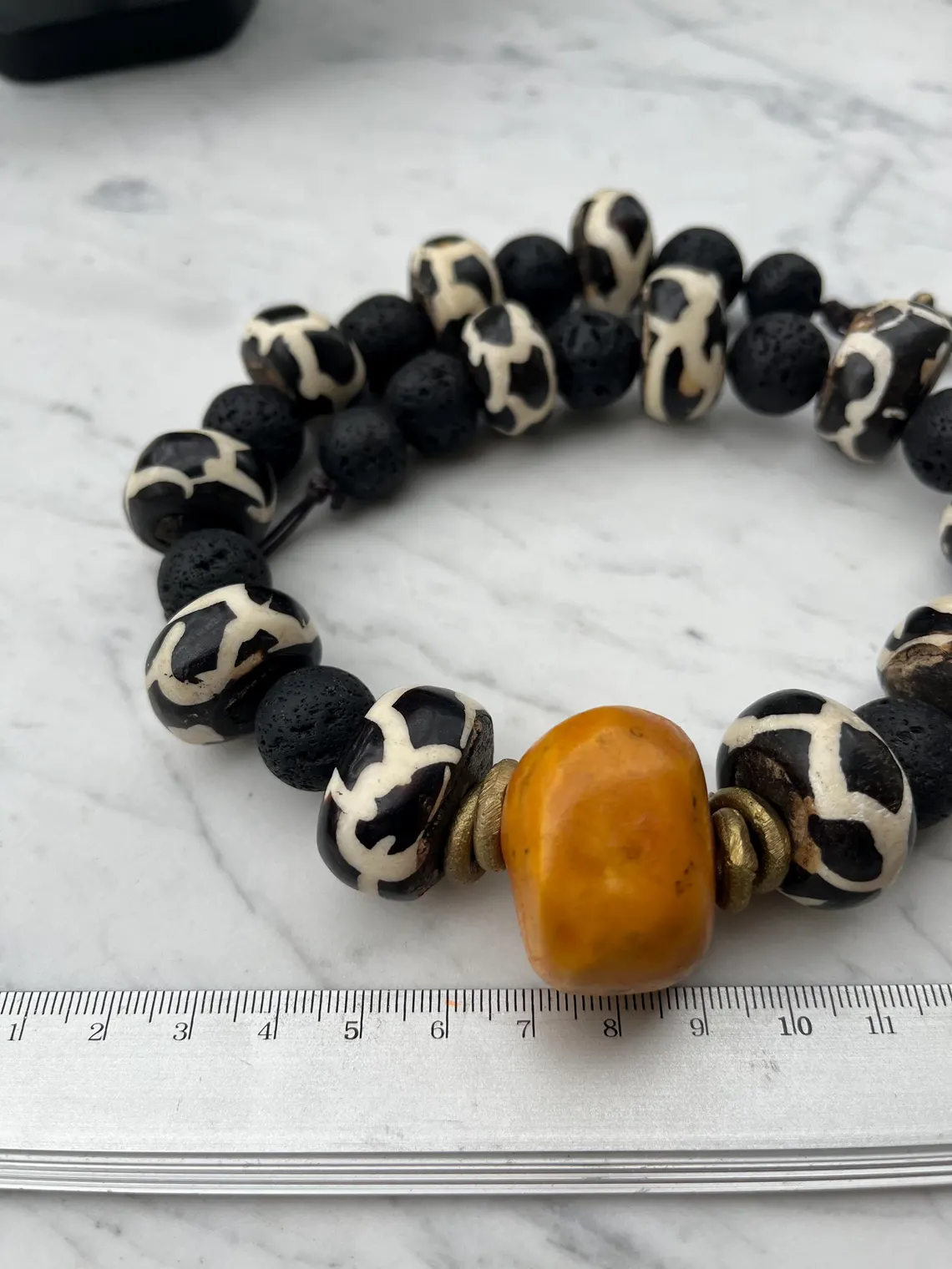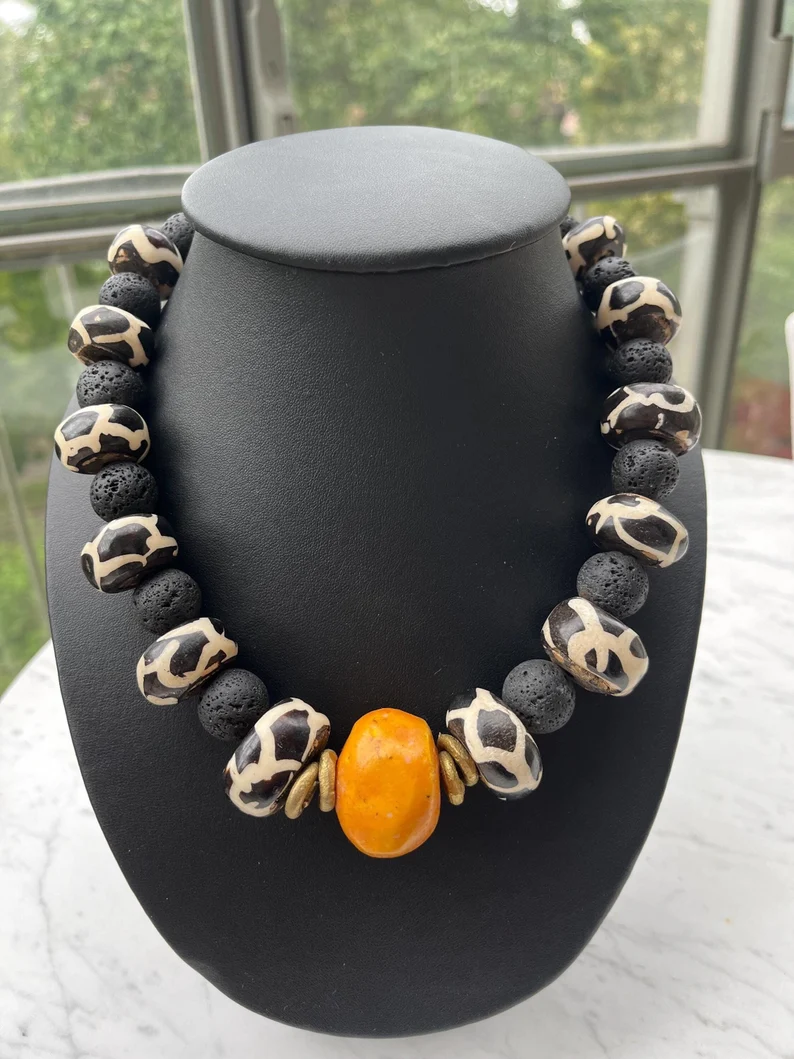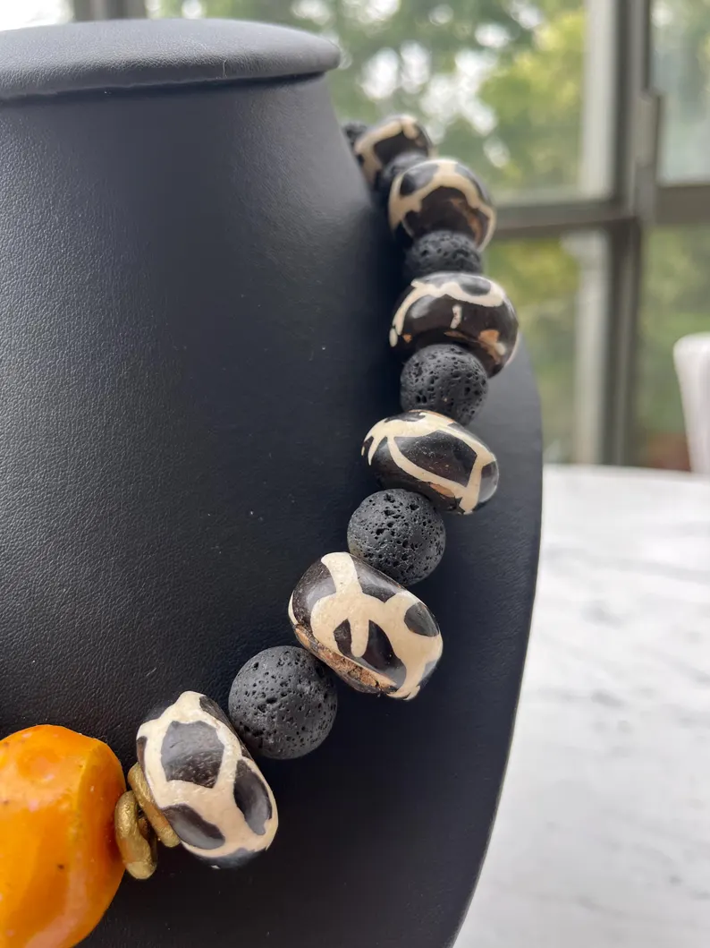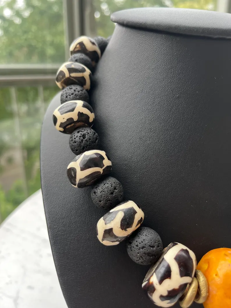 L’ensemble associe des perles noires à texture volcanique, des perles à motifs noir et blanc ainsi qu’une perle centrale orange de grand format, créant un point focal fort.